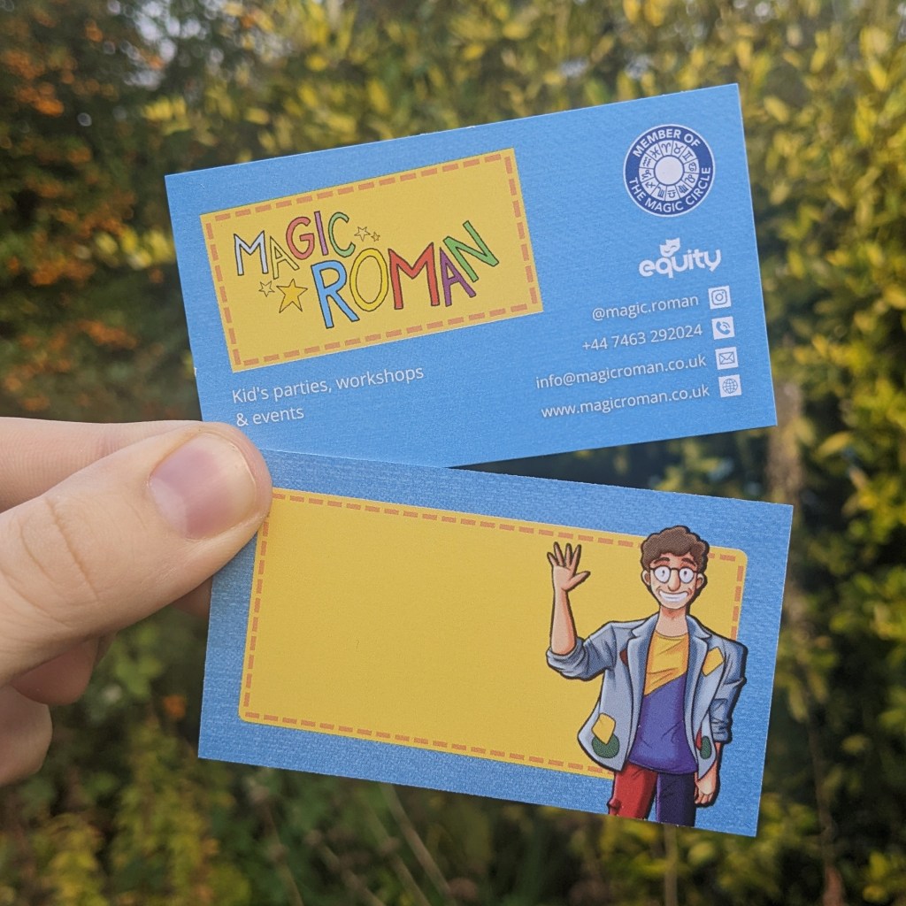 Business cards for Magic Roman, a children’s entertainer. The business cards needed to be colorful whilst containing all the information parents need. Roman also requested a large, blank space where he could write as part of a magic trick. The design was inspired by Roman’s unique, patchwork denim jacket.