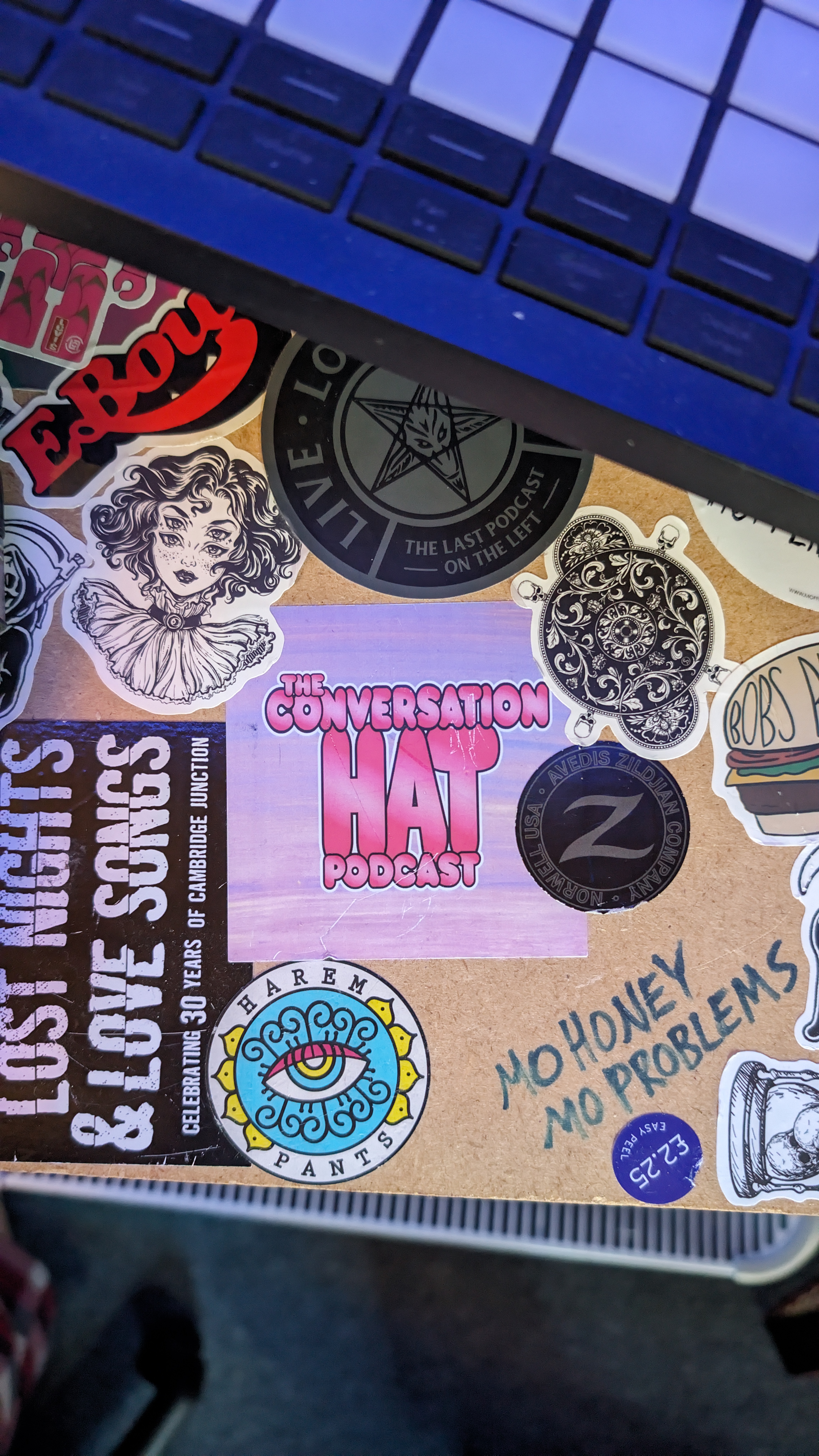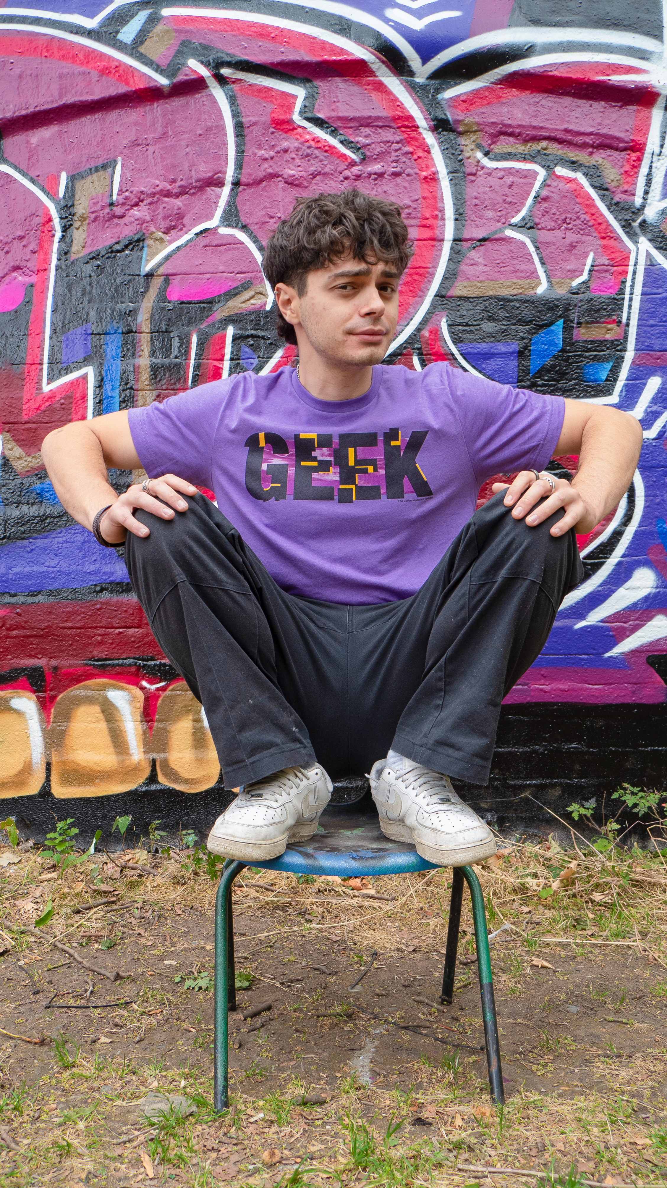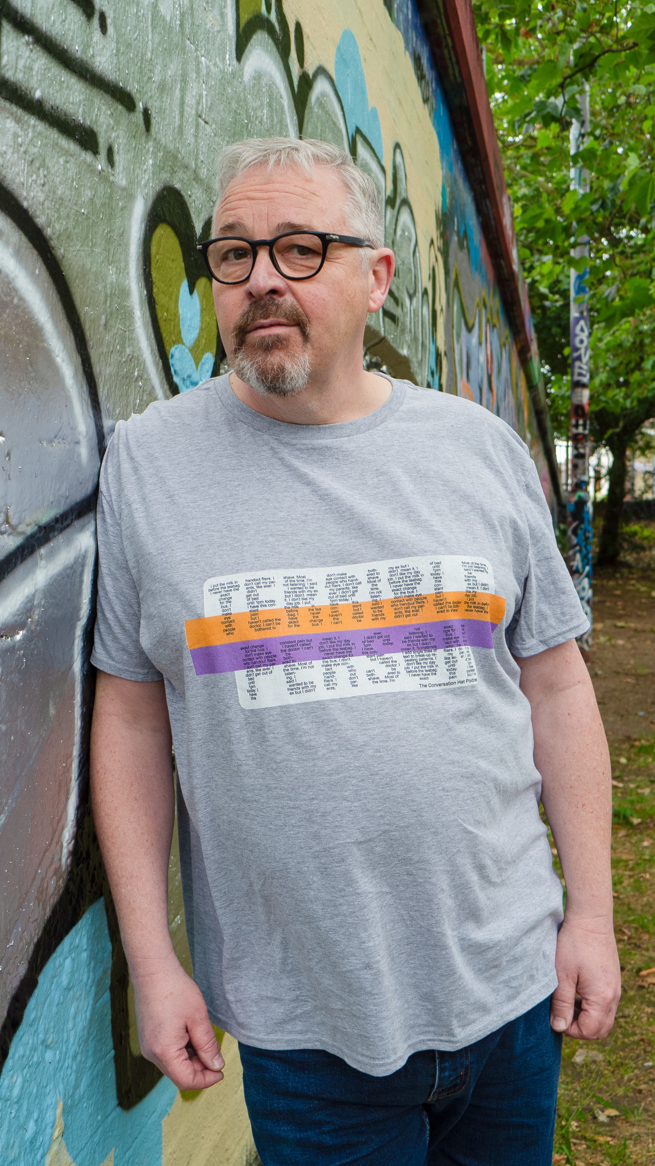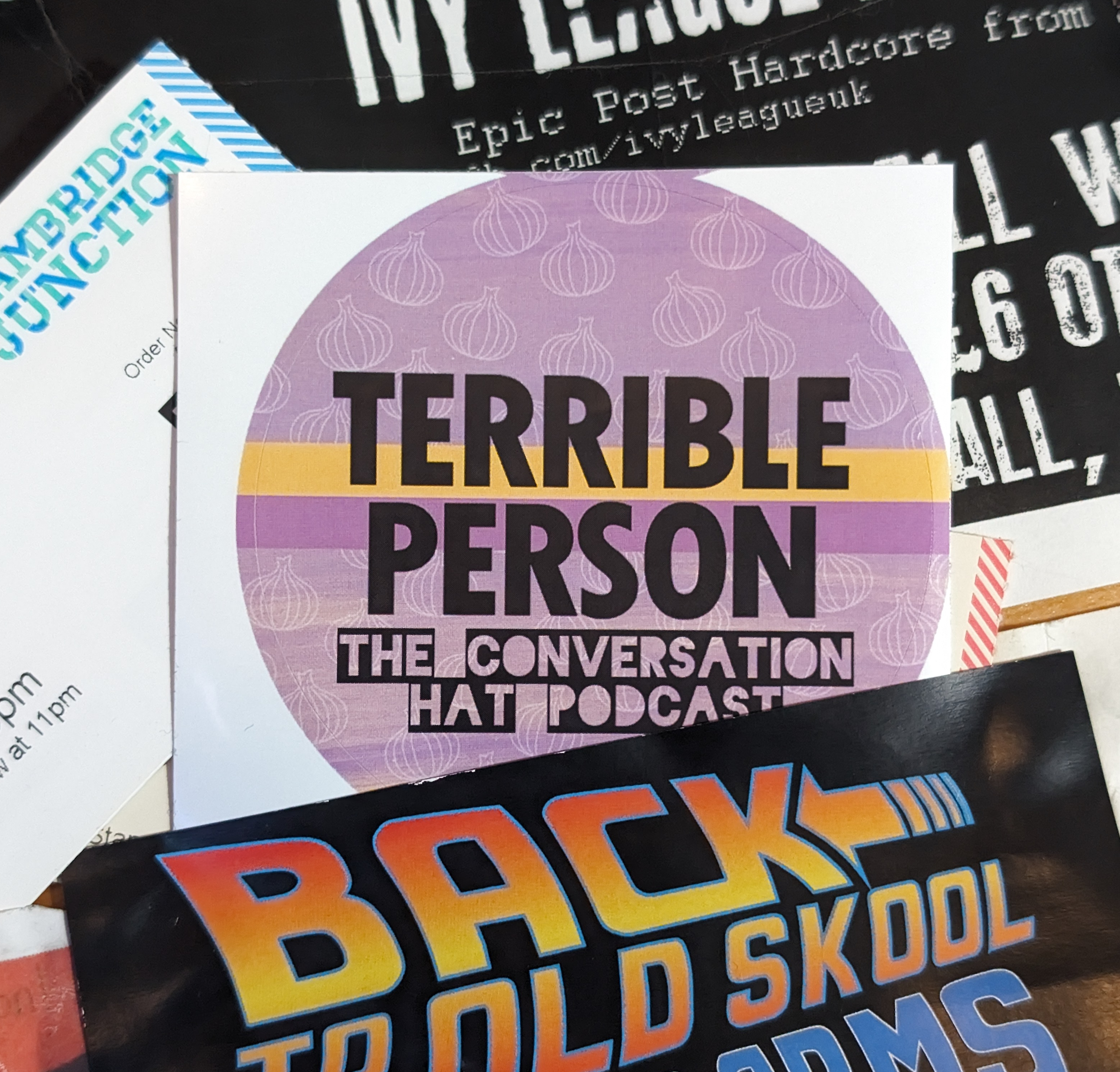The Conversation Hat’s merchandise designs are a great example of using consistent brand elements. The purple painterly background is present on badges and stickers as well as digital designs like show thumbnails. These t-shirts were designed in Adobe Illustrator and printed by TeePublic; the stickers were created in Photoshop and printed by Badges & Stickers.