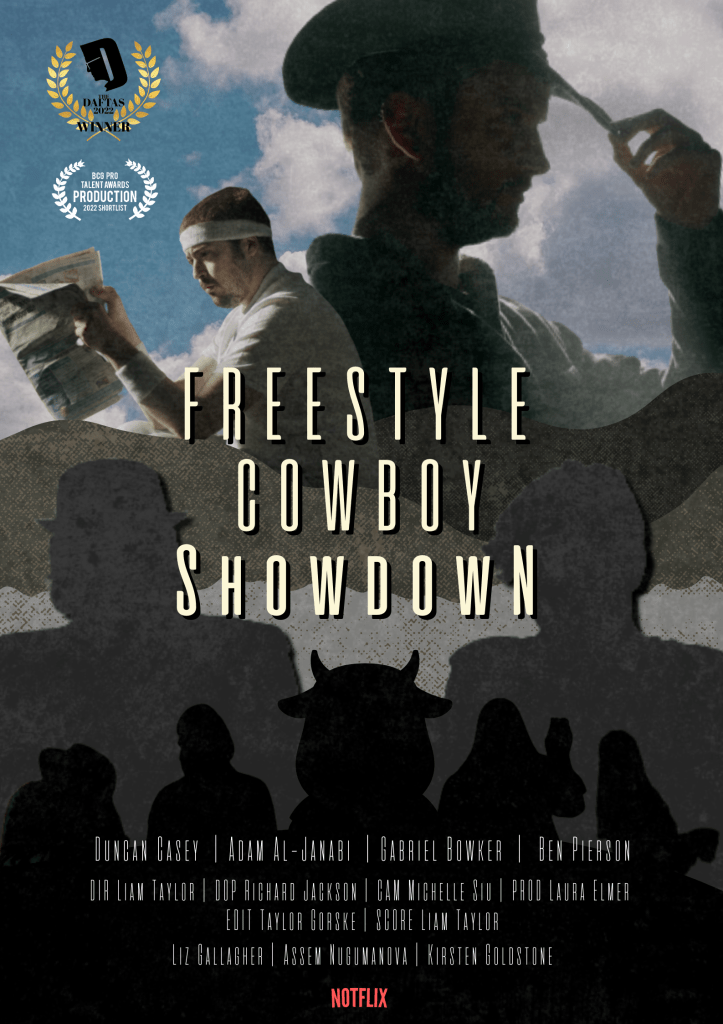 Poster design for Freestyle Cowboy Showdown, comedy short. This design was used to promote the film, and was updated with each award the project won.
