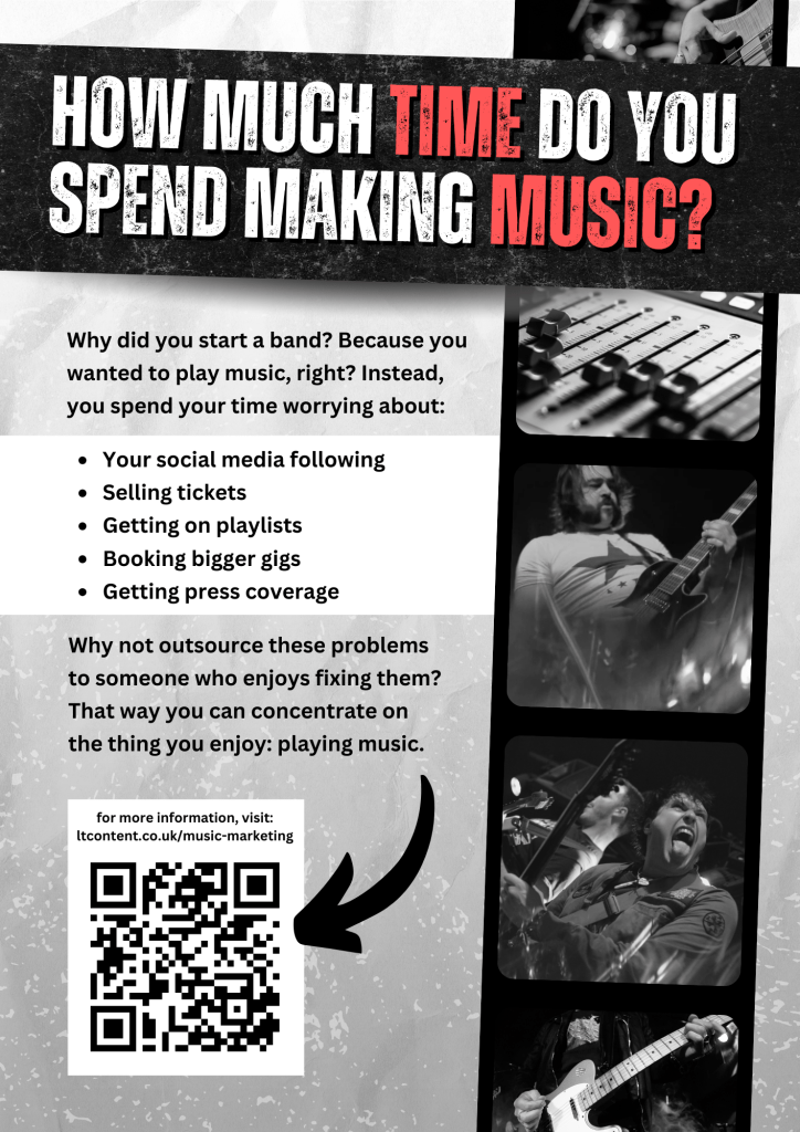 This poster was made to attract more bands and solo artists to visit this website. Typically I wouldn’t have so much text on a poster like this, but this design was placed around a rehearsal space where musicians will spend a lot of time.